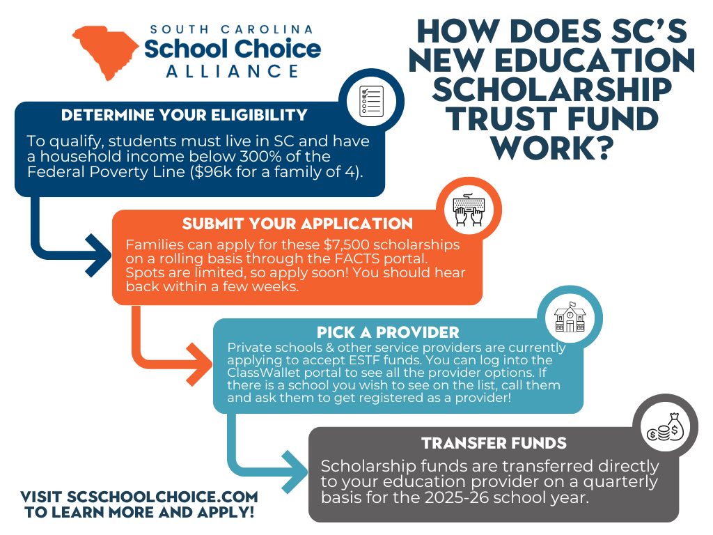 - Applications (through a portal called FACTS) are accepted and awarded on a rolling basis. There are priority application windows for current ESTF students and their siblings, children of military families, households at or below 300% of the federal poverty line, and students enrolled in public school during the previous school year.